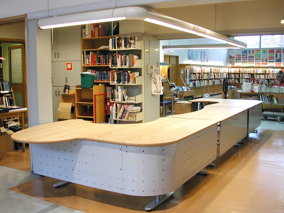 8649 Bibliotekskranke. Skranke med lakkert perforert frontpanel. Plater i eik. Elektrisk Hev senk. Design:OLM/Kunde Forrige Tilbake Neste