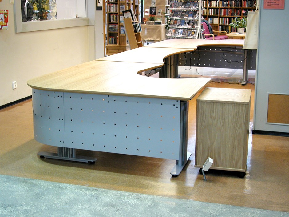 Bibliotekskranke. Skranke med lakkert perforert frontpanel. Plater i eik. Elektrisk Hev senk. Skuffekabinett i eik. Design:OLM/Kunde Forrige Tilbake Neste